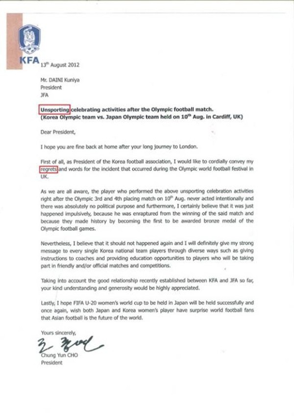 이는 박종우의 '독도 세러머니'가 마음에 들지는 않는다는 것이다. 냉정하게 사과를 한 것은 아니다. 전문 외교인력이 아닌 축구협회의 직원의 단어선택을 지나치게 외교적으로 해석하는 것도 억지스럽다.
