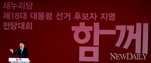 새누리당의 대통령선거 후보 확정을 위한 제2차 전당대회가 열린 20일 오후 경기 고양 일산 서구 킨텍스에서 김태호 새누리당 대선예비후보가 인사말을 하고 있다.