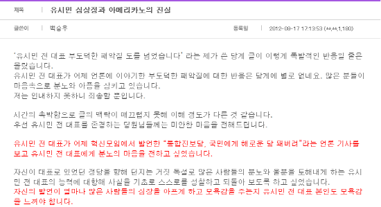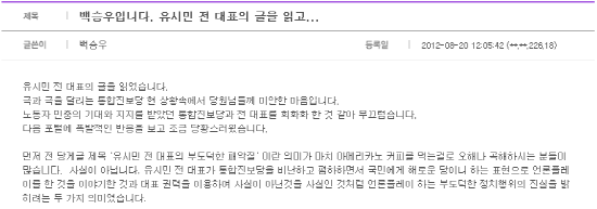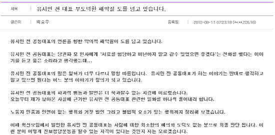 "유시민 전 대표가 혁신모임에서 발언한 "통합진보당, 국민에 해로운 당 돼버려"란 언론 기사를 보고 유 전 대표에 분노의 마음을 전하고 싶었다."