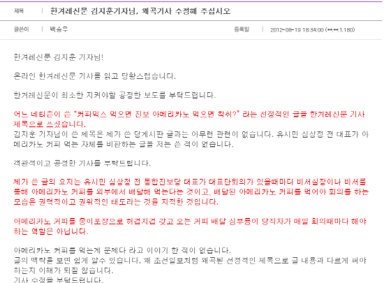 그러면서 "왜 조선일보와 한겨레신문만 통합진보당에 굴절된 시각을 갖고 계시는 진중권씨나 진보신당 대변인 같은 분들의 멘트만을 인용하시는지 이해하기 어렵다"고 했다. 이어 "공정한 기사를 부탁드린다"는 말을 덧붙였다.