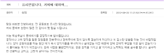 "2003년 4월 제가 처음 국회의원이 되었을 때부터 10년째 함께 일하고 있다. … 제 수행비서 말고 다른 당직자 누구에게도 '커피심부름'을 시킨 적이 없다"며 "저는 '커피심부름'을 했던 제 수행비서를 인간적으로 좋아하고 신뢰하고 존중한다, 10년 동안 단 한 번도 그 사람에게 언성을 높여 말을 한 적이 없다."