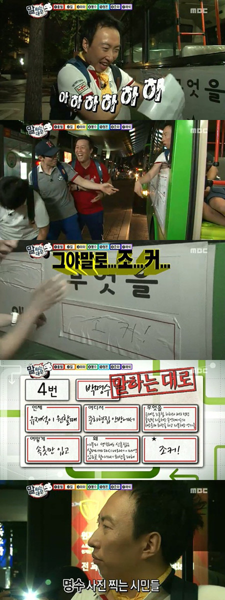 '말하는 대로' 특집은 멤버들에게 서울시내를 순회하는 1대의 버스를 준 뒤, 버스의 표면에 육하원칙에 맞는 조건을 써넣고 문장이 완성되면 이를 수행하는 미션이었다.