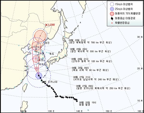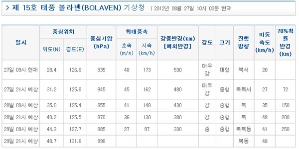 27일 오후 9시에는 제주 서귀포 남남서쪽 240km 지점, 28일 오전 9시에는 목포 서쪽 90km 해상을 통과할 것으로 보인다. ‘볼라벤’이 제주에 도착했을 때는 중심기압 945hpa, 최대 풍속 45m/s(162lm/h), 목포 해상으로 왔을 때도 중심기압 955hpa, 최대 풍속 41m/s(141km/h)의 강력한 위력을 유지할 것으로 보인다.