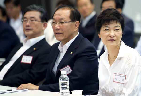 31일 오전 경기도 고양시 일산 킨텍스에서 열린 새누리당 국회의원 및 당협위원장 합동연찬회에 박근혜 새누리당 대통령 후보가 참석해 정책보고를 듣고 있다. 왼쪽부터 이한구 원내대표, 황우여 대표, 박근혜 새누리당 대통령 후보.