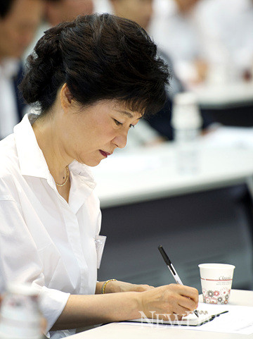 31일 오전 경기도 일산 킨텍스에서 열린 '새누리당 국회의원·당협위원장 합동연찬회'에 참석한 박근혜 새누리당 대통령 후보가 수첩을 적고 있다.