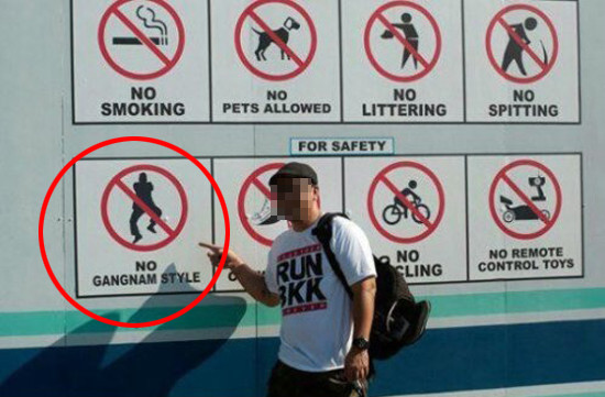 30일 각 해외 온라인 커뮤니티 게시판에는 유머 자료로 '강남스타일 금지구역(NO GANGNAM STYLE HERE)' 이라는 제목의 사진이 한 장 올라왔다.