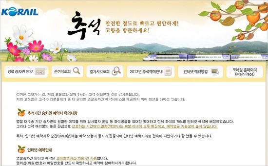 코레일 측은 추석 기차표 예매의 원활한 진행을 위해 전체 좌석의 70%를 인터넷 예약에 배정했으며, 전체의 약 20%에 해당하는 선호 시간대 열차는 대부분 10분 이내에 매진된다고 밝혔다.