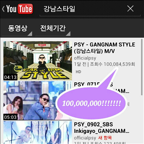 가수 싸이의 '강남스타일' 뮤직비디오가 유튜브 조회수 1억 건을 돌파해 화제다.싸이는 4일 오후 동영상 사이트 유튜브에서 '강남스타일' 뮤직비디오 공개 52일 만에 조회수 1억 건 이상을 달성했다.뿐만 아니라 미국 아이튠즈 뮤직비디오 차트 1위, 미국 아이튠즈 음원차트 30위 등 해외 음반시장에서 놀라운 상승세를 보였다. 이는 강남스타일 뮤비가 한국뿐만 아니라 전 세계적인 관심을 받았기 때문에 가능햇던 것으로 보인다.싸이는 이날 자신의 미투데이에 "'강남스타일' 유튜브 1억뷰 돌파~! 무하하하하하하 감사합니당! 꺅~~!"이라는 글과 함께 1억뷰 돌파 인증샷을 올다.한편 싸이는 최근 미국 최대 음반사인 아일랜드 레코드와 ‘강남스타일’의 전 세계 판권과 매니지먼트 계약을 체결해 글로벌스타로서의 입지를 굳히고 있다.