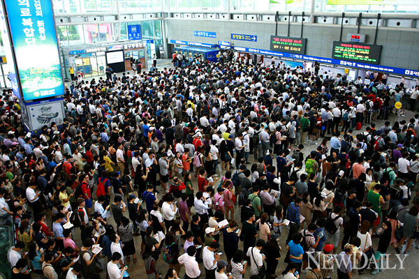 2012년 추석 연휴 열차승차권 예매가 시작된 5일 오전 수원역 대합실에서 승차권 예매를 위해 시민들이 길게 줄지어 서 있다.