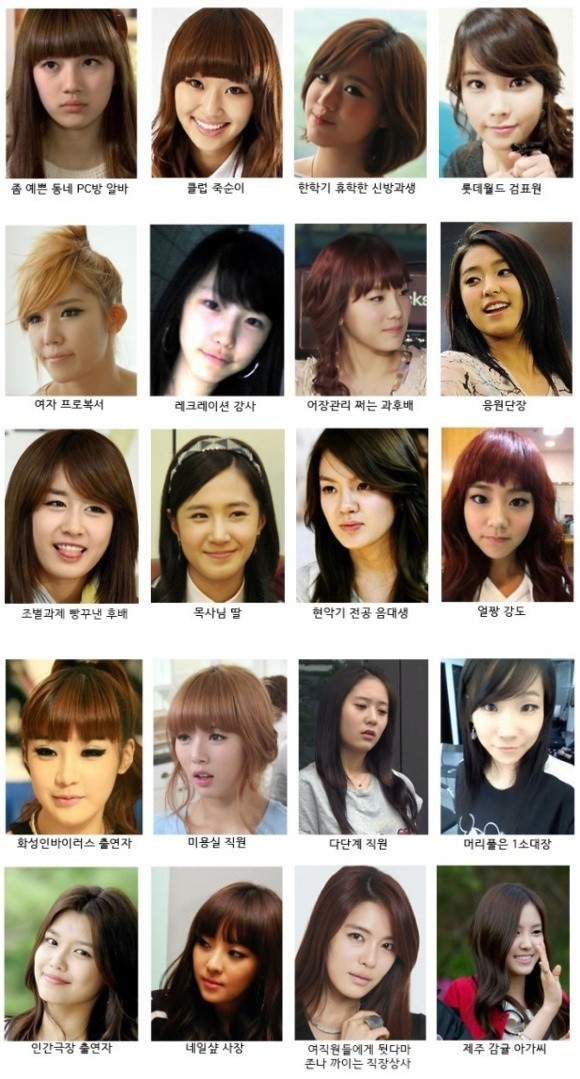아이돌 사진만으로 본 '아이돌 예상 직업'이란 글이 누리꾼 사이에서 화제가 되고 있다.최근 한 온라인 커뮤니티에는 현재 팬들의 사랑을 한몸에 받고 있는 남여 아이돌 사진과 함께, 외모만으로 살펴봤다는 멤버별 예상 직업이 사진 밑에 적혀 있다.해당 게시물에 따르면 아이유는 롯데월드 검표원, 강민경은 성형외과 견적상담원, 빅토리아는 예식장 신부 친구,수영은 인간극장 출연자 등의 내용이 적혀 있다. 크리스탈은 다단계 직원, 유이는 경기도 실종 여대생 등 다소 외모를 비하하는 내용도 있다.이에 게시물을 접한 누리꾼들은 "묘하게 어울린다", "보면 살짝살짝 공감되는 부분도 있다", "생각없이 적은 직업은 좀 심한 부분도 있다"등의 의견을 보였다.