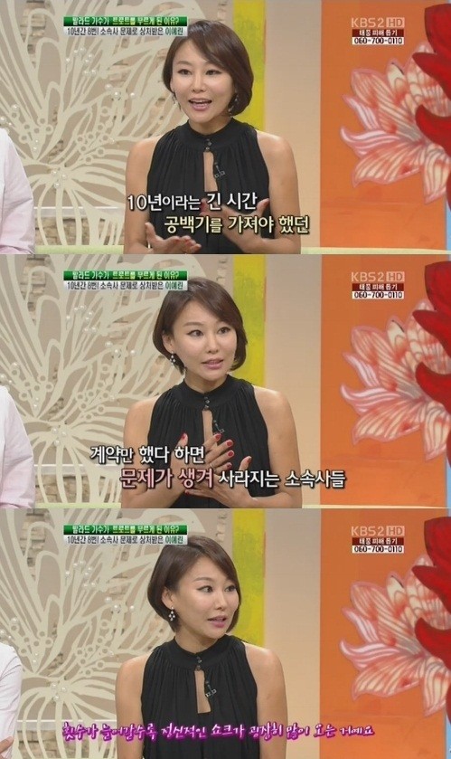 가수 이예린이 10년이라는 긴 시간동안 공백기를 가졌던 사연을 밝혔다.9월5일 방송된 KBS 2TV '여유만만'에는 트로트 가수로 변신한 가수 박일준, 이예린, 이범학이 출연했다.이예린은 "긴 공백에는 내 의사가 전혀 없었다. 계약을 하면 사장님이 없어지거나 상장이 폐지됐다. 총 8번이었다. 세 번까지는 내 판단이 미숙하다고, 아니면 시련의 시기라고 생각할 수도 있었다. 그러나 횟수가 더해질 수록 정신적 쇼크가 왔다"라고 털어놨다.그는 "너무 힘들었고 가슴 아팠다. 노래를 하고 싶어도 회사가 없어서 누굴 탓할 수도 없었다"면서 "그러다 차라리 낯선 곳으로 떠나자 생각했고 친한 언니의 신혼집이었던 영국으로 떠났다. 거기에서 슬픔을 달래며 불렀던 노래가 전통가요 '동백아가씨'였다"라고 트로트와의 인연을 전했다.이예린은 1994년 '포퓰러 나무 아래'로 데뷔해 '늘 지금처럼'으로 인기를 누렸고 2011년에는 트로트 가수로 변신, '야래향'을 발표해 활동 중이다.