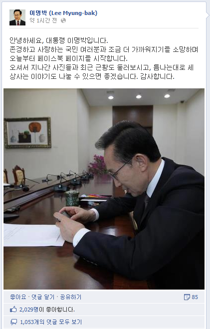 이 대통령은 이날 오후 3시쯤 "존경하고 사랑하는 국민 여러분과 조금 더 가까워지기를 소망하며 오늘부터 페이스북 페이지를 시작합니다"라는 글과 함께 스마트폰을 사용하고 있는 모습이 담긴 사진을 게재했다.