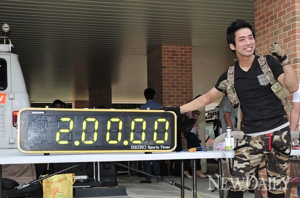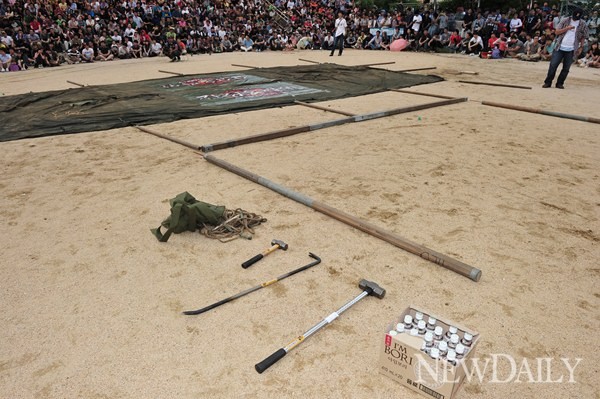 이날 도전자 이상낙 씨(인터넷 동호회 SLR클럽 아이디 'Lv7 벌레')가  혼자서 24인용 군용텐트 설치에 가볍게 성공했다.