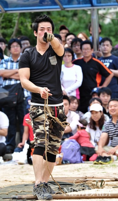 이날 도전자 이상낙 씨(인터넷 동호회 SLR클럽 아이디 'Lv7 벌레')가  혼자서 24인용 군용텐트 설치에 가볍게 성공했다.
