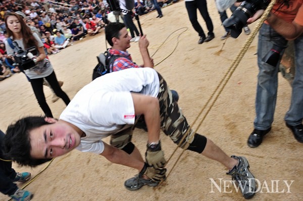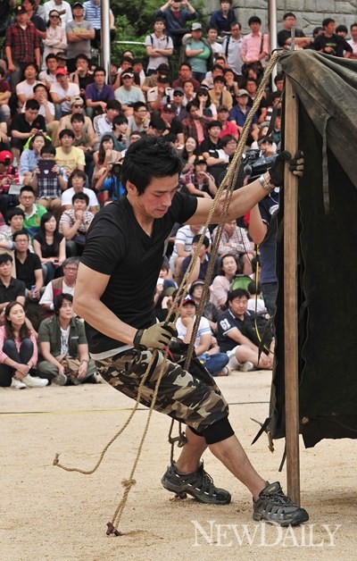 이날 도전자 이상낙 씨(인터넷 동호회 SLR클럽 아이디 'Lv7 벌레')가 혼자서 24인용 군용텐트 설치에 가볍게 성공했다.