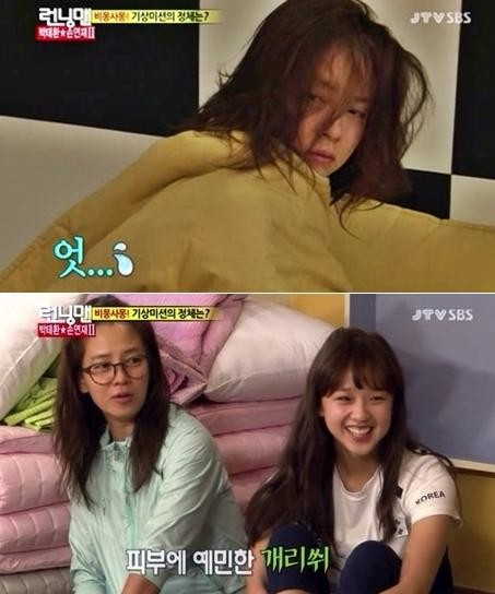 손연재는 차분한 머리와 탱탱하고 잡티하나 없는 뽀얀 피부를 과시한 반면 송지효는 부스스한 머리와 얼굴이 부은 상태로 나와 상반되는 모습을 보였다.