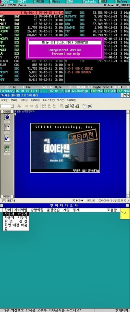 약 17년 전에 사용하던 컴퓨터 프로그램들의 메인 화면이 담겨있는 이 사진에는 MDIR, 새롬데이타, 한메타자 등 도스(DOS) 시절 유용하게 써왔던 프로그램들이 담겨있다.