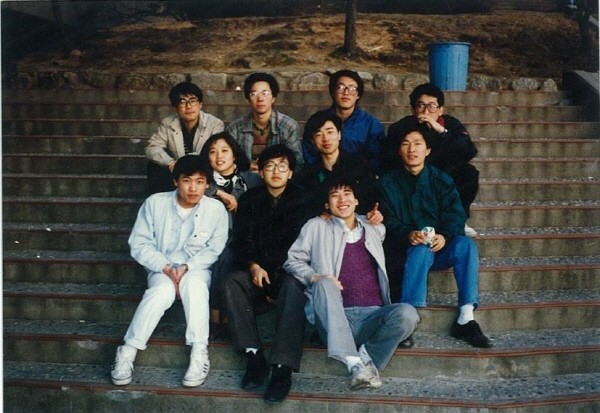 "대학시절 친구들과 함께 찍은 사진들 중 일부입니다. 사진을 보면 앞줄 두번째(검은옷) 안경쓴 친구가 태섭이이고 사진 오른쪽으로 태섭이 무릎 위에 팔을 대고 웃고 있는 사람이 저입니다."