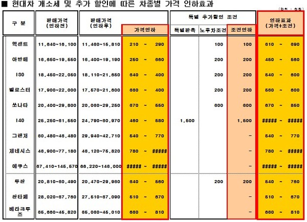 자동차 개별소비세 인하에 따른 현대기아차의 차량가격 인하 분은 최소 21만원부터 최대 257만원까지다.