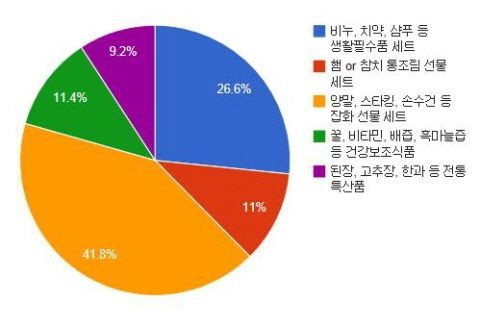 이어 2위는 응답자 26.6%가 지목한 비누와 샴푸 등 생필품세트, 3위는 된장과 한과, 햄 등 먹거리가 9%를 차지했다.