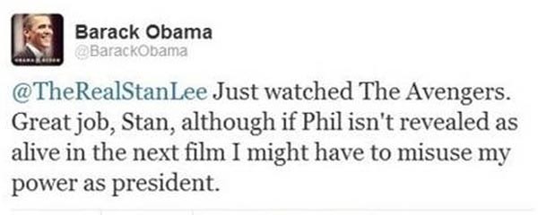 오바마 대통령은 자신의 트위터에 "영화 어벤져스를 봤다. 너무 재미있었다. 그런데 2편에서 '필'이 살아있는 걸로 해주지 않으면 내 '대통령의 권한'을 잘못된 곳에 사용할 지도 몰라"라고 말했다.
