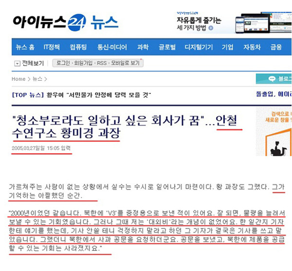 그러나 안 씨 측의 해명과는 전혀 다른 증거가 발견됐다. 바로 ‘안랩’의 황미경(1996년 4월 입사) 부장의 증언이다. 황 부장은 과장 시절은 2005년 3월27일 인터넷 매체 <아이뉴스24>와 가진 인터뷰에서 ‘아찔했던 순간’으로 ‘V3백신’을 북한에 보냈던 것을 언급했다.