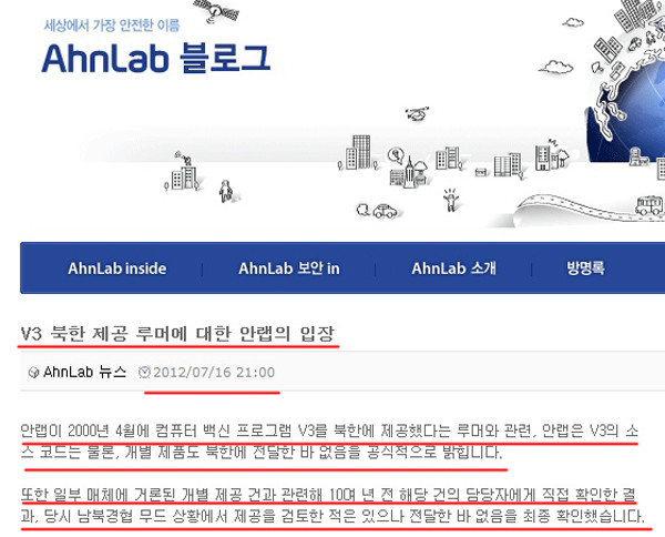 안랩, 2000년 증정용으로 北에 ‘V3백신’ 보내■ 안철수연구소(안랩)가 2000년 남북정상회담을 앞두고 ‘V3백신’을 비공식적으로 북한에 전달했는지의 여부에 대해 안랩은 최근 보도자료를 통해 “V3 개별제품 뿐 아니라 소스코드도 전달한 바 없다”고 했었다(기사하단 '안랩' 블로그 캡쳐화면 참고).