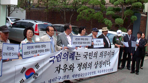 이들은 지난 6일부터 13일까지 통합진보당을 비롯 전교조·민노총 등 단체를 방문하면서 <국민의례 준수를 촉구하는 기자회견>을 열고 태극기 전달식을 갖고 있다.