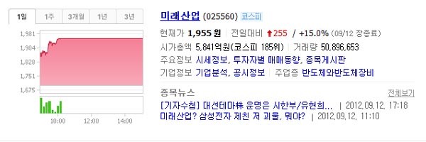 9월 12일 미래산업의 주가는 전일대비 15% 상승했다. 그래도 225원 오른 1,955원. '작전세력'이 아니라면 엄청난 이익을 보기 어렵다.