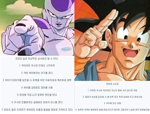 하지만 이 게시물에는 직장이나 사회에서 사실 프리더는 착한 상사이며 손오공은 상대해서는 안되는 사람으로 표현한다.