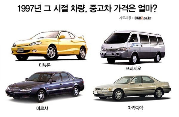 97년 당시 자동차들도 고유의 특성을 간직한 채 현재에도 거래되고 있다. 현대자동차의 국산스포츠카인 ‘티뷰론’의 경우, 수입차 구입이 어려웠던 당시 날렵한 디자인과 기존 국산차에 비해 빠른 속도감으로 젊은 세대들에게 엄청난 관심과 사랑을 얻었던 모델이다.