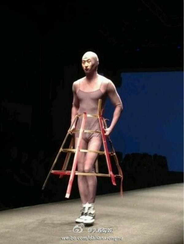 사진 속 한 남성은 란제리를 연상시키는 살색 전신 타이즈를 입고 프레임으로 된 치마모양 구조물을 걸친 기괴한 모습으로 당당하게 런웨이를 걷고 있다.