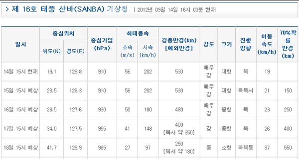 기상청에 따르면 14일 15시 현재 태풍 '산바'는 중심기압 910hpa, 최대풍속 56m/s(203km/h), 영향반경 530km의 매우 강한 태풍인 상태라고 한다.