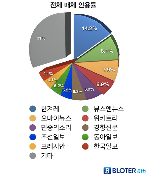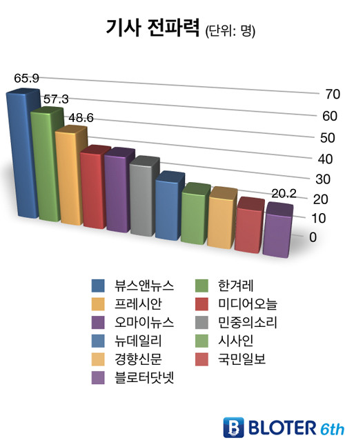 -블로터닷넷■ '기사전파력' = 이 부문에서 <뉴데일리>가 7위를 차지했다. '기사 전파력'은 한 기사를 얼마나 많은 사용자들이 퍼트렸는지를 보여준다.