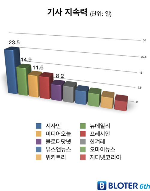 기사 지속력 부문 1등은 평균 23.5일인 <시사인>이 차지했다. <미디어오늘>과 <프레시안>은 평균 11.6일(3위), <한겨레>의 기사는 평균 8.2일로 5위였다.
