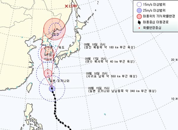 기상청이 예상하는 태풍 '산바'의 경로를 살펴보면 16일 오후 3시 제주 서귀포 남쪽 550km에 이르면서부터 우리나라에 서서히 영향을 미치기 시작해 17일 오후 3시에는 여수 북서쪽 40km 지점에 상륙, 18일 오후 3시 북한 청진 지역을 통과해 빠져나갈 것으로 보인다.