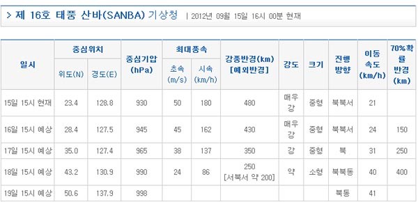기상청에 따르면 태풍 '산바'는 15일 오후 3시 현재 중심기압 930hpa, 최대 풍속 50m/s, 영향 반경 550km로 매우 강력한 중형 태풍의 상태를 유지하고 있다.