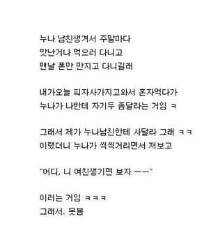 게시물에는 한 네티즌이 작성한 글로, 누나와 동생의 대화가 전개되고 있다. 내용을 보면 혼자 피자를 먹고 있던 동생을 본 누나가 자기도 먹게 피자를 달라고 했다. 이에 동생은 “누나 남자친구한테 사달라고 해”라고 했고, 누나는 씩씩거리며 “어디 네 여자친구 생기면 보자”라고 전했다.