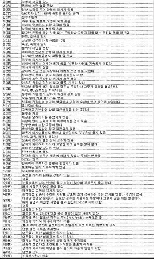 공개된 '이름에 안 좋은 한자' 사진은 음양오행 사주를 캡쳐한 것으로 이름에 쓰면 안 좋은 한자의 뜻을 풀이했다.