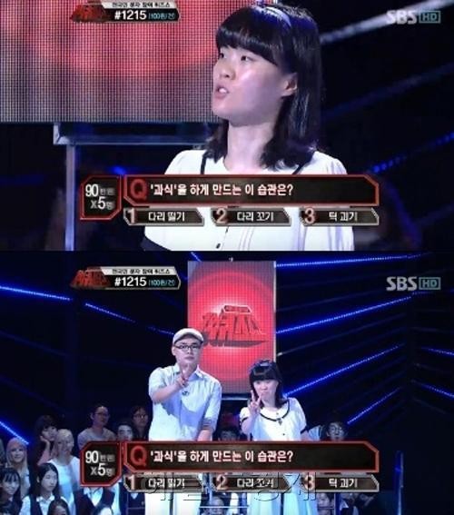 지난 14일 방송되 SBS '세대공감 1억 퀴즈쇼'에는 개그맨 박지선과 박영진이 출연해 '과식 부르는 습관'에 대한 문제를 풀었다. 과식 부르는 습관 문제의 보기는 '다리 떨기', '다리 꼬기', '턱 괴기'가 제시됐다.