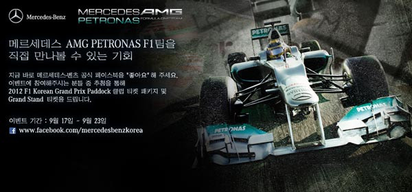 메르세데스 벤츠 코리아㈜(www.mercedes-benz.co.kr)가 2012 F1 코리안 그랑프리 티켓 증정 이벤트를 실시한다.