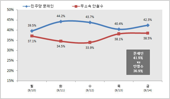 여론조사 전문기관 <리얼미터>는 야권 단일 후보 선호도 조사의 9월 둘째 주 주간집계에서 문재인 후보의 지지율은 41.9%, 안 원장의 지지율은 36.9%로 조사됐다고 17일 밝혔다.