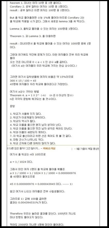 게시물에는 여학생이 드문 공대에 예쁜 여학생이 들어올 확률을 수학 공식으로 풀어놓았다.