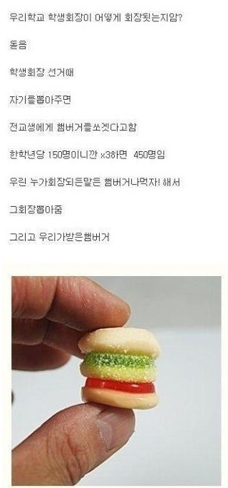 게시물 작성자는 "우리학교 학생회장이 선거때 자기를 뽑아주면 전교생에게 햄버거를 쏘겠다고 했다"라며 "한 학년당 150명이니깐 3을 곱하면 450명이다. 우린 누가 회장이 되든 햄버거나 먹자해서 그 회장을 뽑았다. 그리고 우리가 받은 햄버거"라며 한장의 사진을 공개했다.