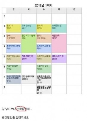 공개된 사진에는 문제의 대학생이 신청한 수강시간표가 담겨있다. 하루에 무려 6~7과목을 신청한 학생의 시간표에는 점심시간조차 존재하지 않는다.
