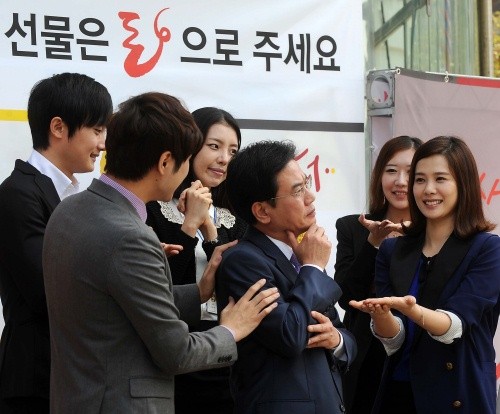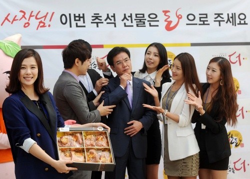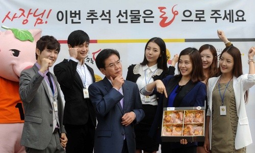 이날 이벤트는 회사 직원들이 사장님에게 추석 선물로 국산 돼지고기인 한돈 선물세트를 요구하는 내용으로 진행됐으며 한돈 홍보대사 김현주씨도 사장님에게 한돈 선물세트를 요청하는 직장인 역할로 참여했다.