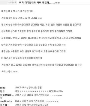 그는 "어머니랑 이모, 삼촌이 휴스턴에서 한식당하고 아버지께서 세탁소를 하시는 데 한국인 업소라며 요즘 부쩍 손님이 늘었다. 이모부는 용역업체를 하시는데 싸이 이야기 듣고 이모부네 업체에 용역을 맡기는 미국인이 늘어났다"며 "싸이, 사랑해"라고 말을 맺었다.