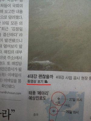 사진 속에는 4대강 사업을 우려하는 사진기사의 캡션에 붉은 색 동그라미가 쳐져 있다.