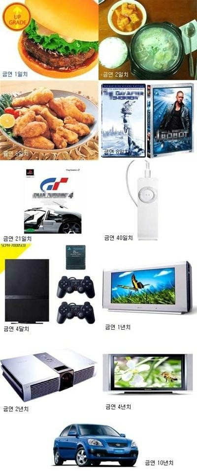 게시물에 따르면 담배를 끊었을 때 금전적 효과가 바로 나타난다. 40일간 담뱃값을 절약하면 최신 MP3 플레이어를 살 수 있다. 4달간 금연하면 큰솔 게임기를 살 수 있고 1년간 금연하면 최신 TV를 살 수 있을 정도의 돈을 모을 수 있다.