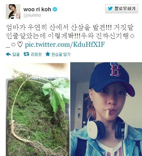 고우리는 앞서 지난 17일 자신의 트위터를 통해 "엄마가 우연히 산에서 산삼을 발견. 거짓말인 줄 알았는데 이렇게. 우와 진짜 신기해"라는 글과 함께 산삼을 공개한 바 있다.
